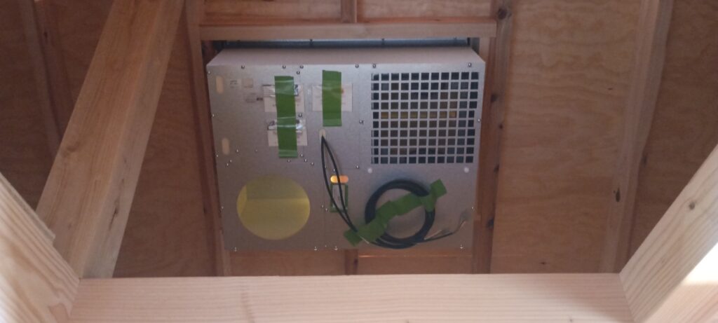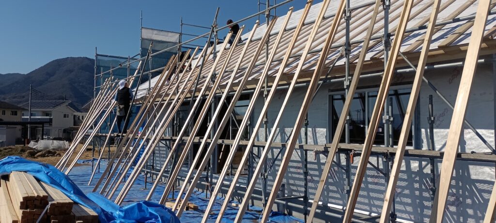 外部では屋根下地通気垂木を…(鼻先から外気を取り入れて集熱面で空気を暖めるのである)