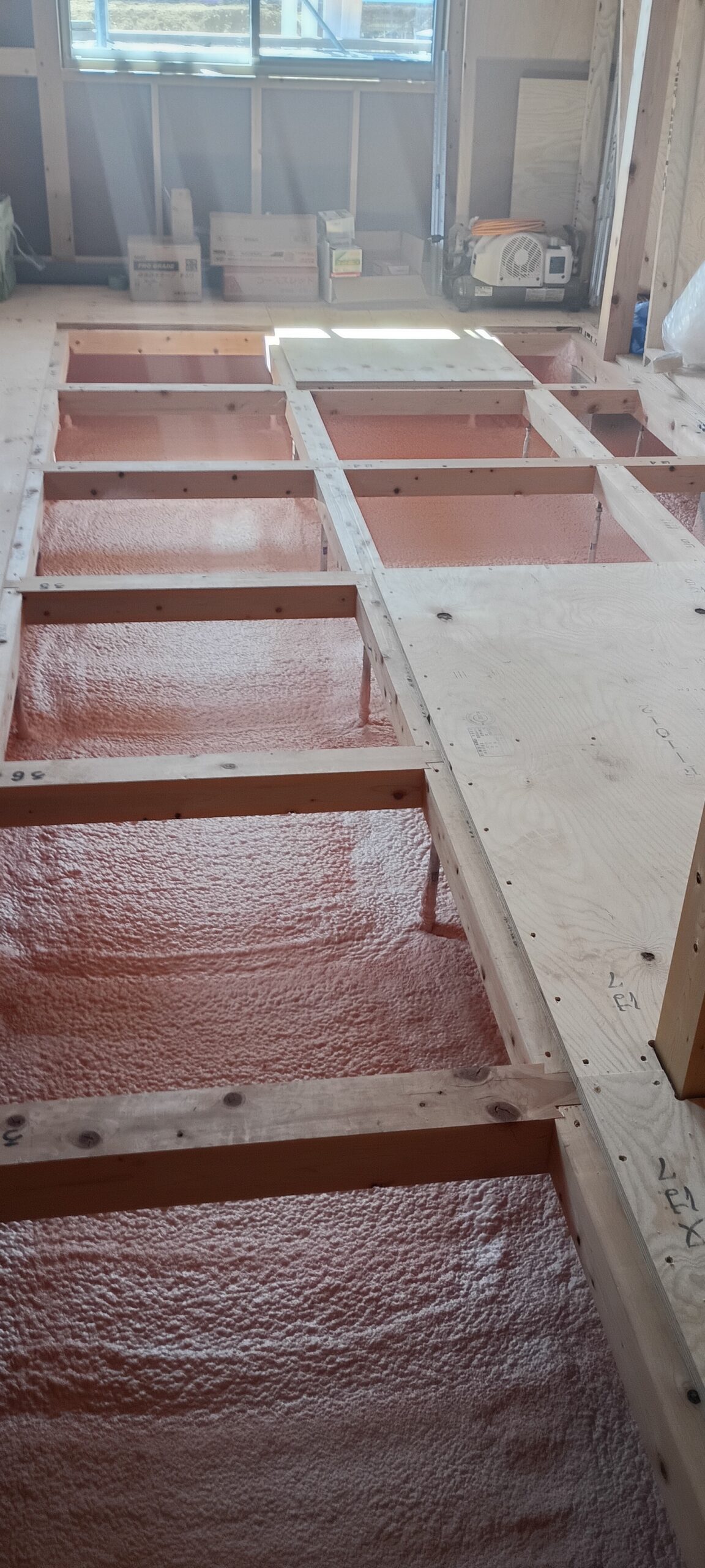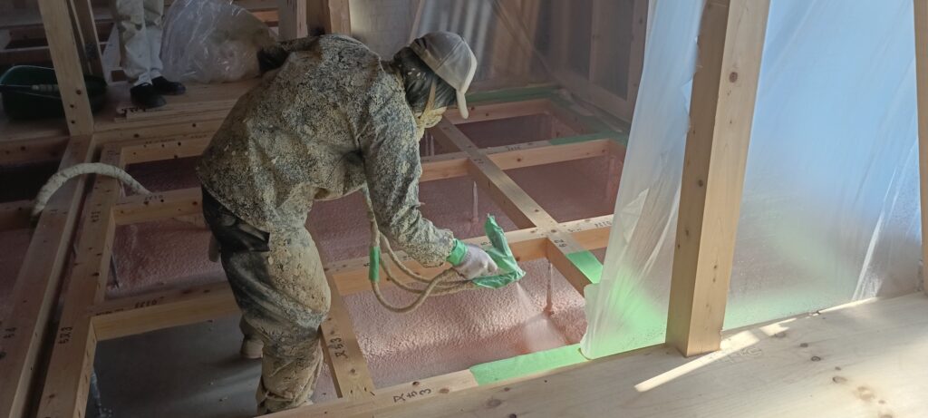 土間硬質発砲ウレタンの施工。これで気密断熱の確保が出来る