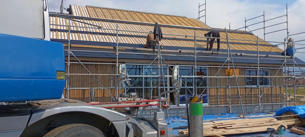 長尺ガルバリウム鋼板を現場で成型する。約15m。